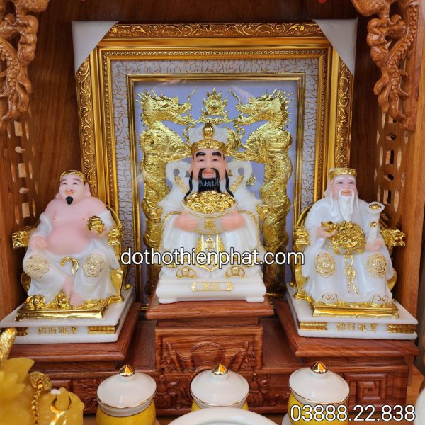 - Hai tượng thần tài ông địa chúng ta đặt tượng thần tài bên trái, ông địa bên phải. Nếu gia chủ thờ 3 ông (gồm ông thần tiền). Thì ông Thần Tiền được đặt ở giữa ông thần tài và ông địa hoặc đặt trên nóc bàn thờ nếu gia chủ không thờ Phật Di Lặc.